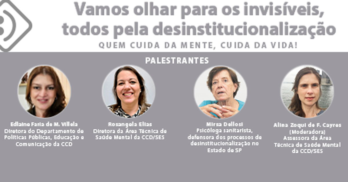 A Coordenadoria de Controle de Doenças, por meio da Área Técnica de Saúde Mental, realizou nesta segunda-feira, 20 de janeiro, a webconferência “Vamos olhar para os invisíveis, todos pela desinstitucionalização”. O evento marca as ações da Coordenadoria no movimento Janeiro Branco, pela conscientização das questões e necessidades de saúde mental e emocional, e que também se inserem na missão de prevenir, promover e proteger a saúde de toda a população.