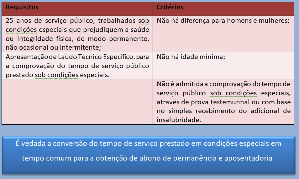 Informações complementares 1. O aposentado especial que retornar à atividade terá o benefício suspenso, mas a lei não veda o retorno à atividade comum com perda da aposentadoria; 2. Caso o segurado tenha laborado em condições especiais e passe a trabalhar em atividade comum, é possível a conversão do tempo especial em comum, proporcionalmente, conforme tabela constante no regulamento da previdência social.