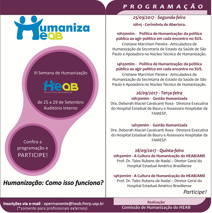 De 25 a 29 de setembro de 2017 acontecerá a III Semana de Humanização no Hospital Estadual Américo Brasiliense, região de Araraquara.